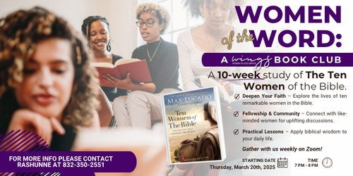 WINGS invites you to the Spring Book Club series Women of the Word. Contact Rashunne Singletary for more information at 832-350-2551.