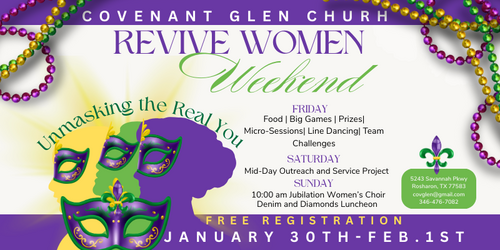We have scheduled our "Revive Women" weekend for January 30- February 1. Our theme is Unmasking the REAL YOU! Our goal is to make Revive Weekend a time of bonding, fellowship, and spiritual growth without the high price tag of most women's event weekends. After registration, you will receive details for your weekend. Remember, it's Free Registration! This event usually retails at $150.00 or more per person. You can attend all or just the events that fit your schedulehttps://covenantglenunitedmethod.subspla.sh/rw8rfnm